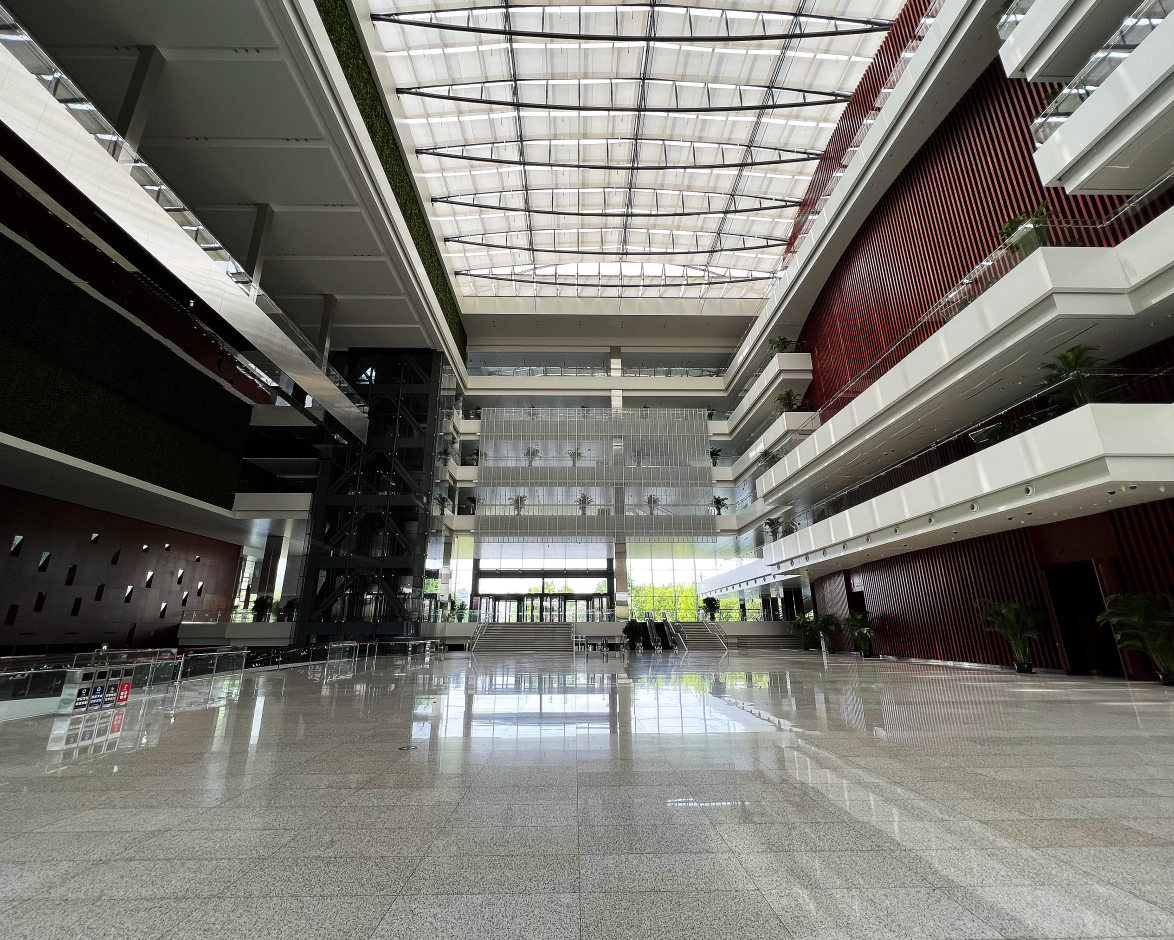 绿厅位于世博中心一层,建筑面积约2000㎡,七层挑高设计,玻璃外墙通透,采光视野俱佳。内设380㎡超大 LED 屏,核心功能包括高端礼宾接待、会议仪式、小型展览及文艺演出。