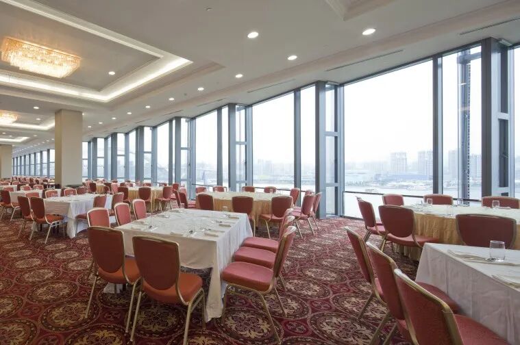 金厅是4500平方米无柱式豪华宴会厅,最多可容纳3000人同时就餐。可按需分隔为两个独立宴会厅(1500平方米和3000平方米)。厅外设有宽敞休息区和露天平台,配套茶歇及休憩功能;临江露台视野开阔,浦江胜景尽收眼底。
